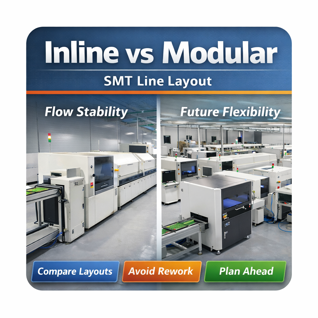 Inline-layout udmærker sig ved stabile løb med stort volumen med kontinuerligt flow og højhastighedsplacering som JUKI og Hanwha. Modulært layout giver bedre modstandsdygtighed over for ændringer, high-mix lavvolumen og fremtidige udvidelser med lettere integration af IKT-inspektion og buffere. Det rigtige valg afhænger af produktmix, volumenstabilitet, inspektionsplaner og tolerance for fremtidige ændringsomkostninger – ikke kun initial plads eller pris. Brug 5-punkts tjeklisten til at matche din virkelige situation og undgå dyrt omarbejde senere.
